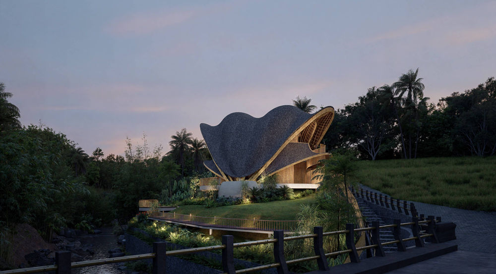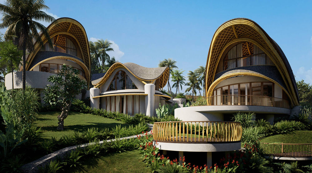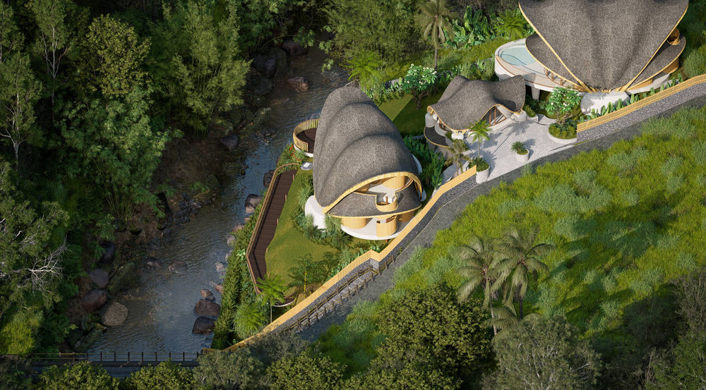 “A pair of sculptural, bamboo-framed villas with sweeping organic roofs inspired by tropical petals. Elevated on terraced greenery above a stone riverbank, the architecture blends natural materials, fluid biomorphic curves, and open-air living to create a modern eco-luxury retreat immersed in lush landscape.”.